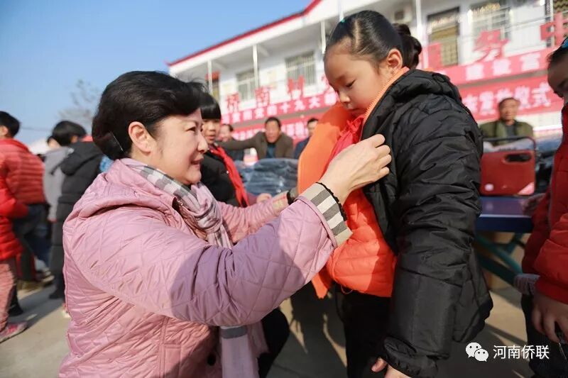 2017年冬,寒风凛冽,"漂洋过海"到达河南的部分爱心棉衣,在漯河市临颍县桥南村举行发放仪式。全村的孤寡老人、留守儿童和贫困群众都领到了爱心棉衣,乡亲父老喜气洋洋,交口称赞。河南省侨联、漯河市侨联、临颖县委统战部主要负责同志出席活动,省侨联党组书记、主席董锦燕亲手为孩子试穿棉衣。