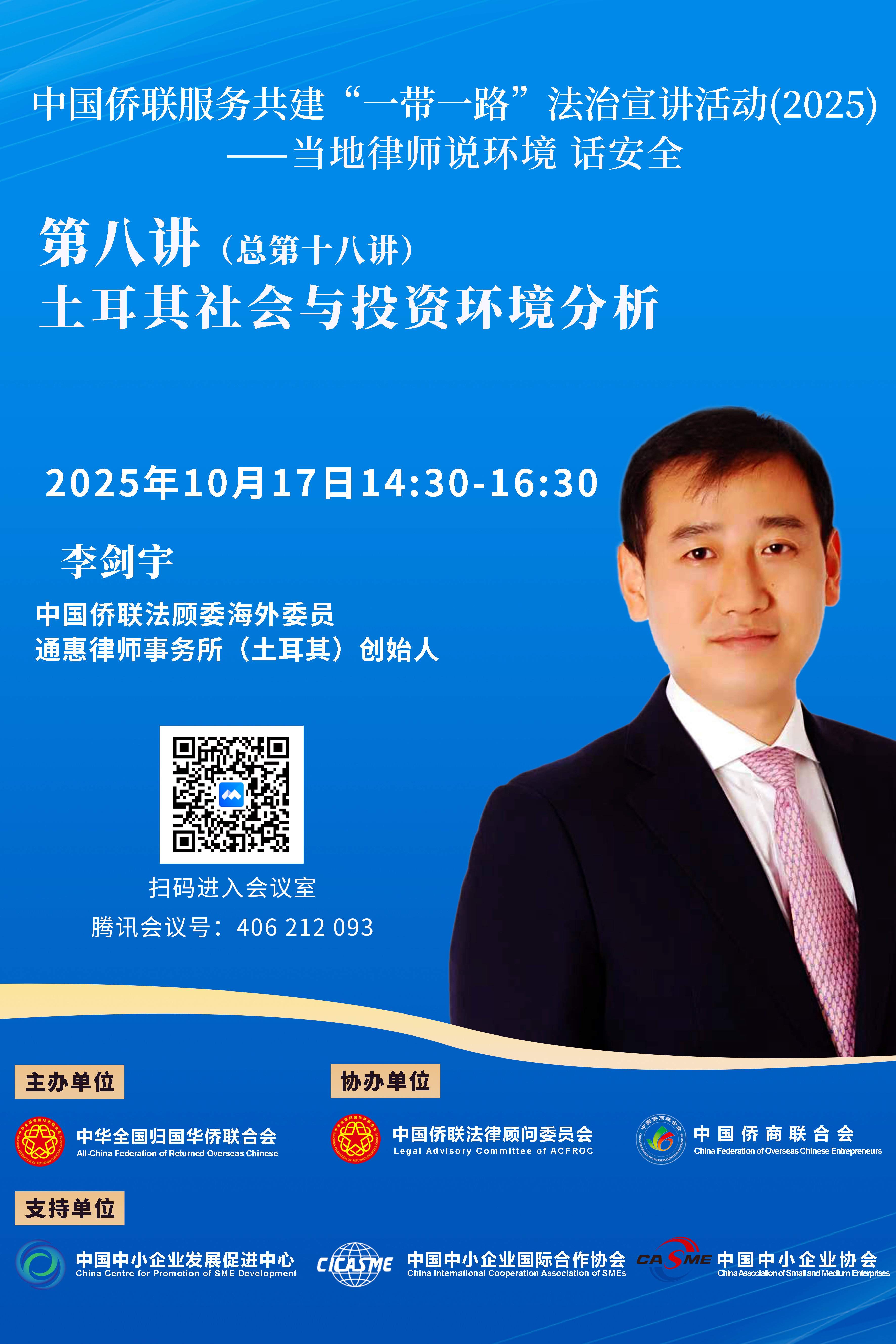 今年第八讲(总第十八讲)将于2025年10月17日(周五)14:30开播,由中国侨联法顾委海外委员土耳其李剑宇律师主讲。李律师毕业于大连大学,获国际经济法学士学位,毕业后先后在竞天公诚律师事务所、海华永泰律师事务所、上海复轩律师事务所担任律师,参与不同企业上市、重组、投资及商业诉讼项目,广泛接触各类经济行业。2020年李律师赴土耳其创办通惠律师事务所,为广大中资企业与中国公民提供法律服务,并多次举办公益法律服务讲座,助力中资企业与中国公民更好维护权益。